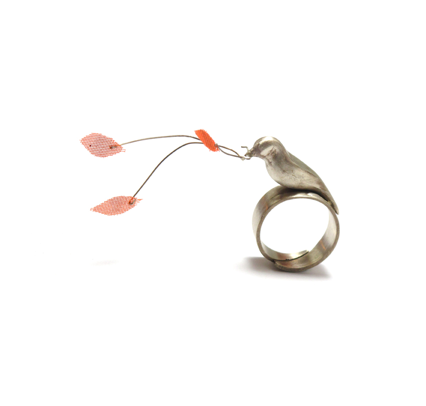 A partir de la pieza «Dios aprieta pero no ahorca II», Chiky (Ursula Agustin) me pidió un anillo como ese, en plata (el original es en alpaca) y más fácilmente portable. Le conté que el original llevaba partes de cintas reactivas para medir la insulina usadas por Pepe, que si quería podía usar otro material para su anillo. Me dijo que no, que de ese modo tendría algo de cada uno de nosotros. Chiky es artista y es profundamente sensible. Este es su anillo.
